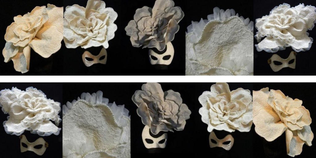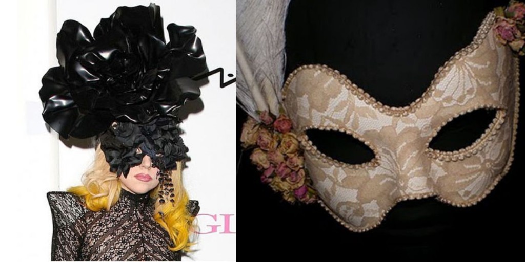 Izquierda: Referencia de Lady Gaga. Derecha: Nuestro diseño de antifaz con rosas secas y encaje.